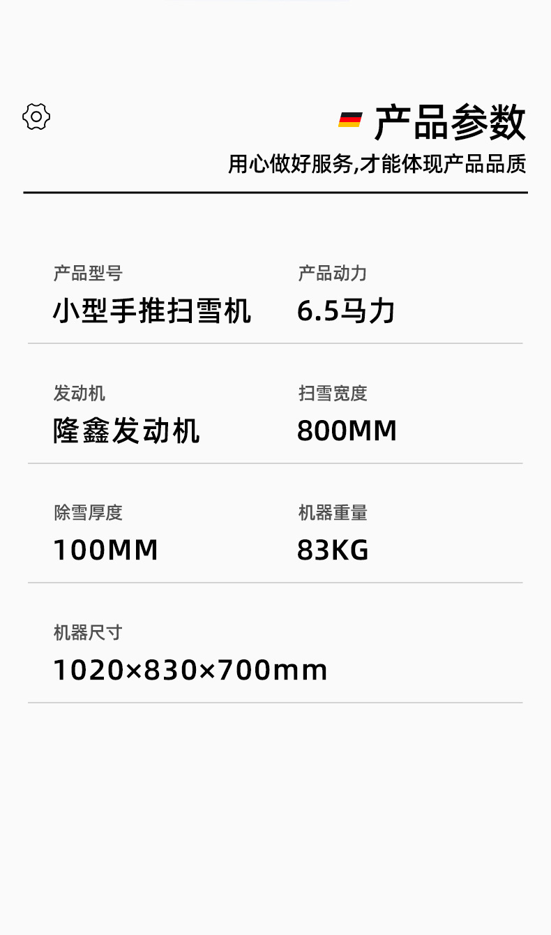 品牌:WACHTEL 型號: 6.5P手推除雪機 發動機:隆鑫6.5馬力196CC 燃油類型:汽油/柴油 燃油/機油容量:3.6L/0.6L 除雪寬度:800 mm 除雪深度:150mm 工作時間:4h