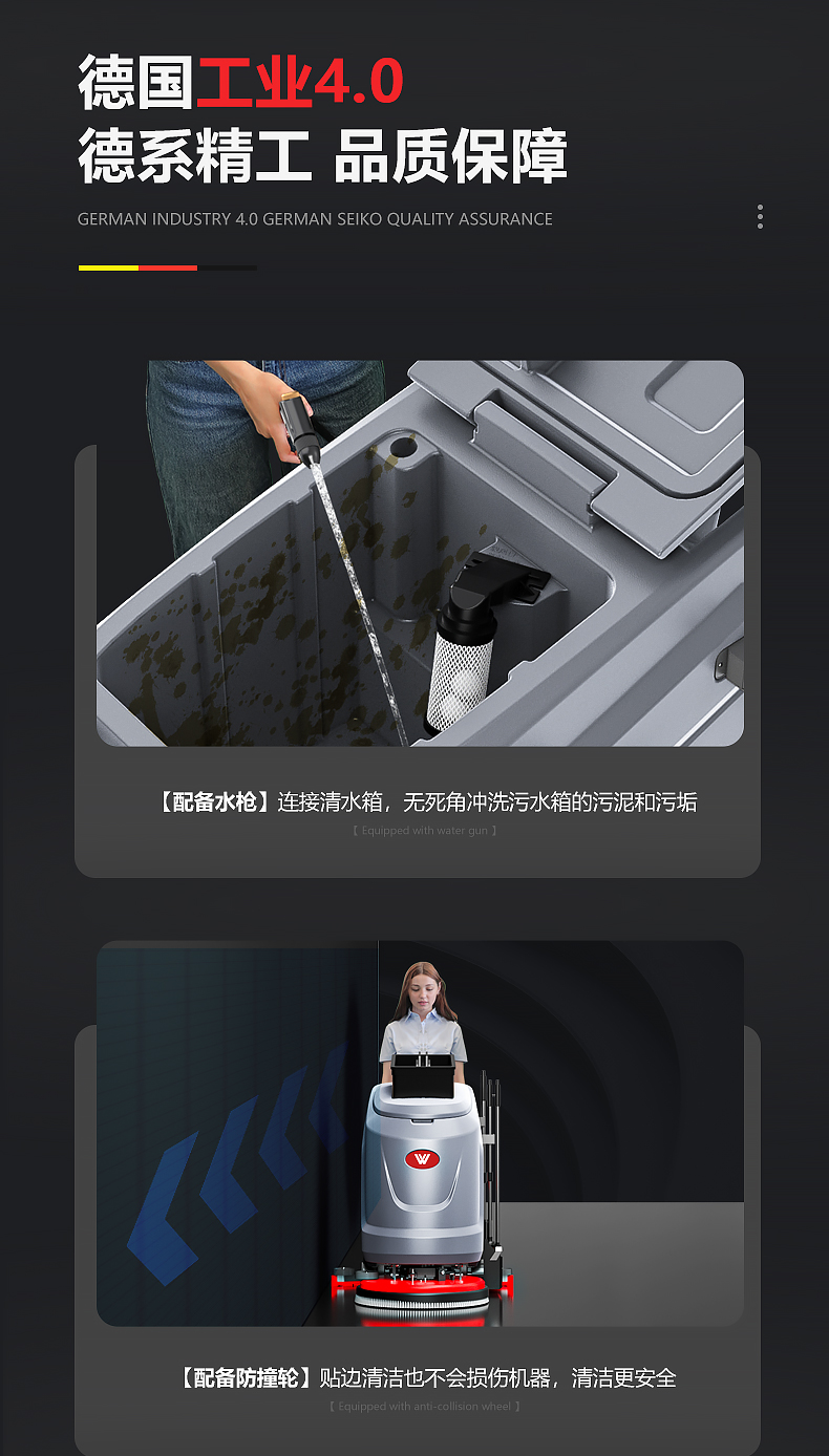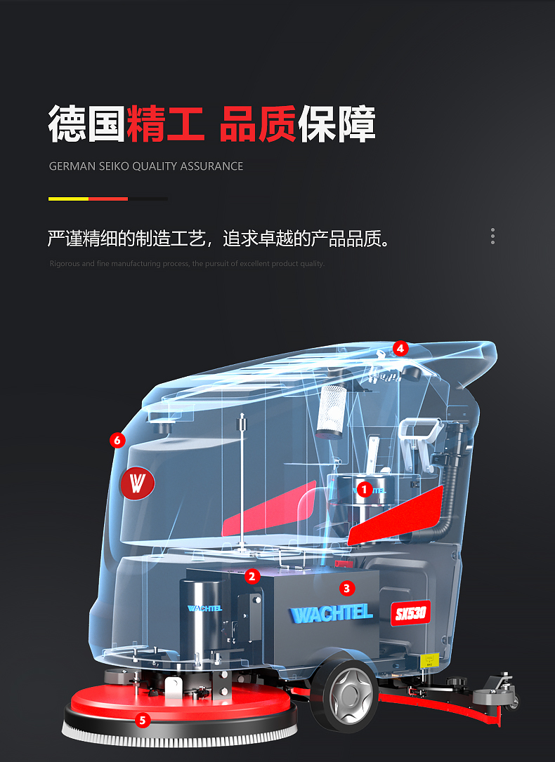 品牌:WACHTEL 名稱:多功能商用手推式洗地機 型號: SX530 清掃寬度:530 mm 清潔效率:2600m²/h 工作時間:3~4h 水箱容量:71L/65L(清/污) 電池:意大利OM鋰電 電機::德國瓦赫電機 整機重量:102kg 產品尺寸:1110*830*1000mm 適用清潔場所: 商場 超市 車庫 車間 辦公樓等