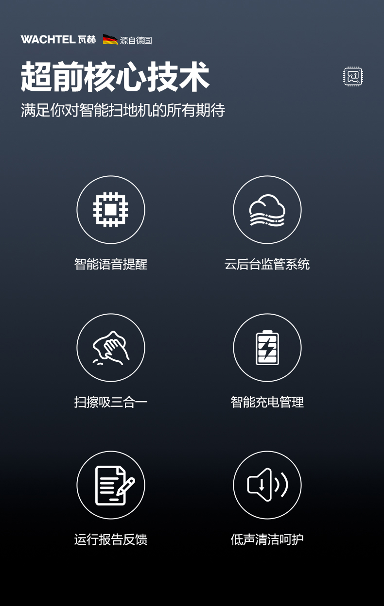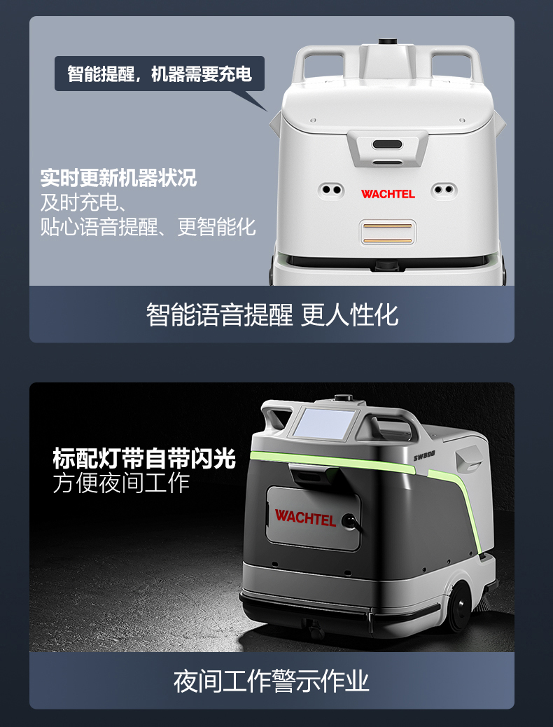 品牌:WACHTEL 名稱:掃拖吸一體智能機器人 型號:SW800 功能:掃地+洗地+吸塵+塵推 特點:自動充電+自動避讓+自動乘梯+斷點續掃 控制方式:自動/人工 外觀尺寸: 1020*847*915mm 充電樁尺寸:430*290*440mm 清潔寬度:600 mm 塵推寬度:800 mm 清潔效率:2300m²/h 工作時間:4h 工作噪音:≤63dB 電池:24V/50AH/100AH鋰電池 重量:150kg 防護措施:激光雷達+超聲探頭+深度攝像頭