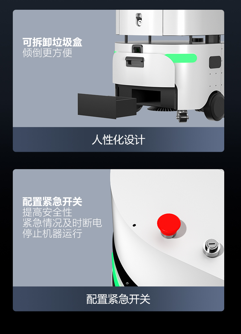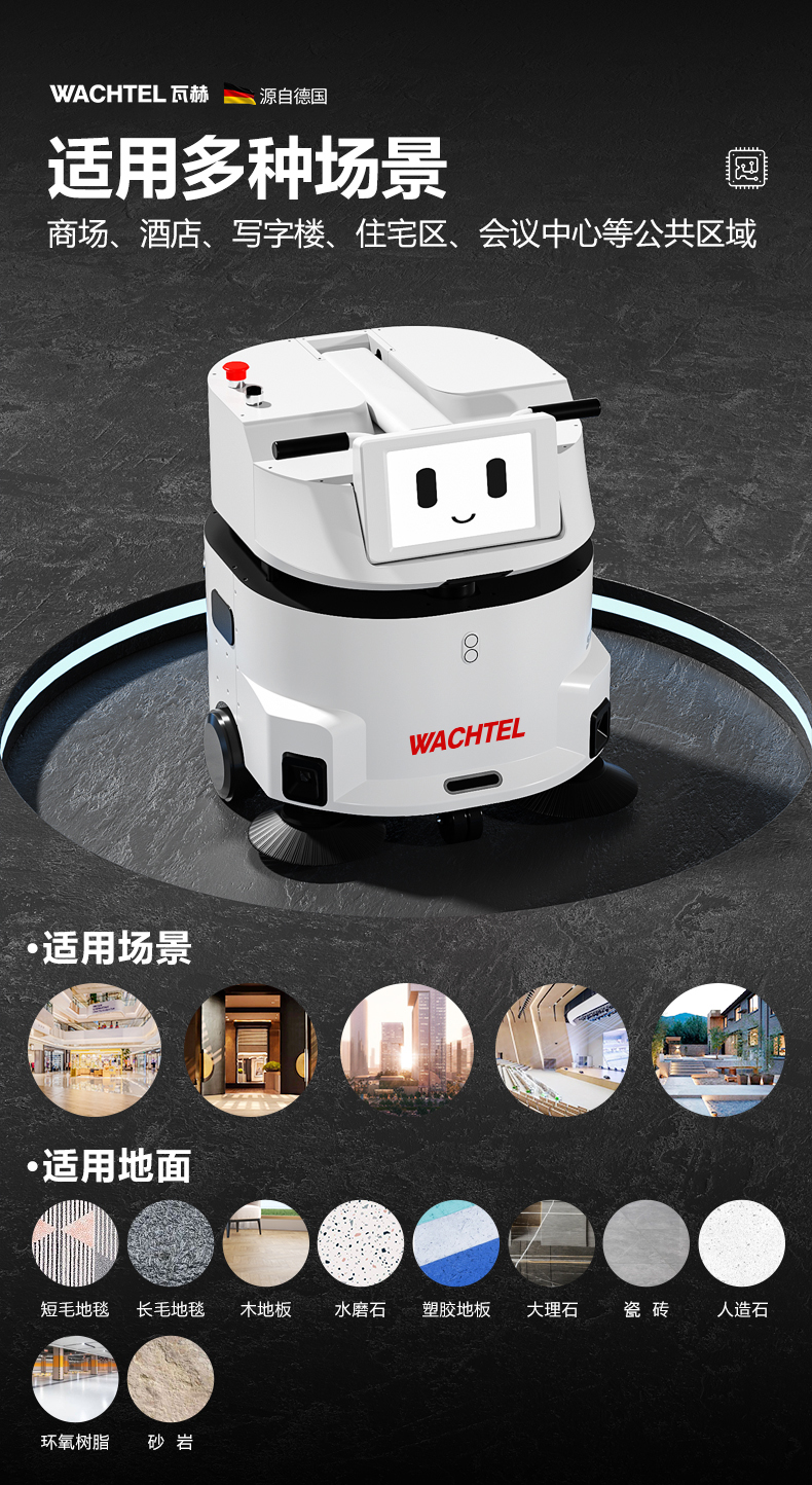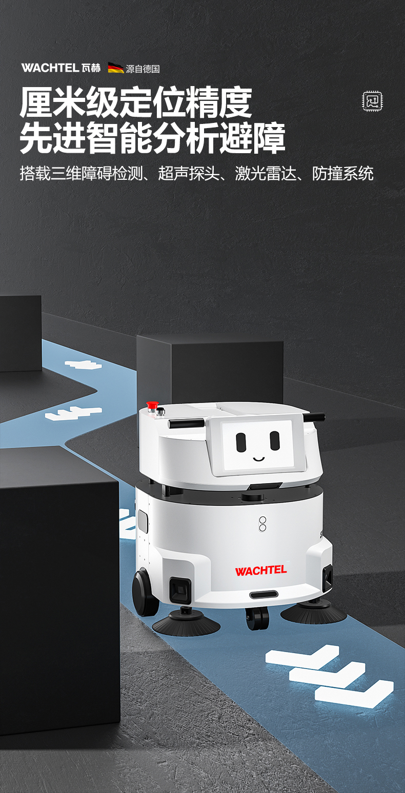 品牌:WACHTEL 名稱:掃拖吸一體智能機器人 型號:SW550 功能:掃地+洗地+吸塵+塵推 特點:自動充電+自動避讓+自動乘梯+斷點續掃 控制方式:自動/人工 外觀尺寸: 615*585*630mm 充電樁尺寸:430*290*440mm 清掃寬度:550 mm 清潔效率:1600m²/h 工作噪音:≤62dB 工作時間:5~8h 電池:24V/50AH鋰電池 重量:85kg 防護措施:激光雷達+超聲探頭+深度攝像頭